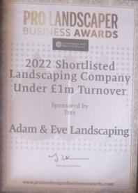 In 2020, Adam &amp; Eve was awarded the ‘Under Thirties Business Owner’ certificate by Pro Landscaper<Magazine. In 2022, we were ranked among the top five landscaping businesses in the UK (under £1million turnover), a reflection of our dedication to high standards and excellence.